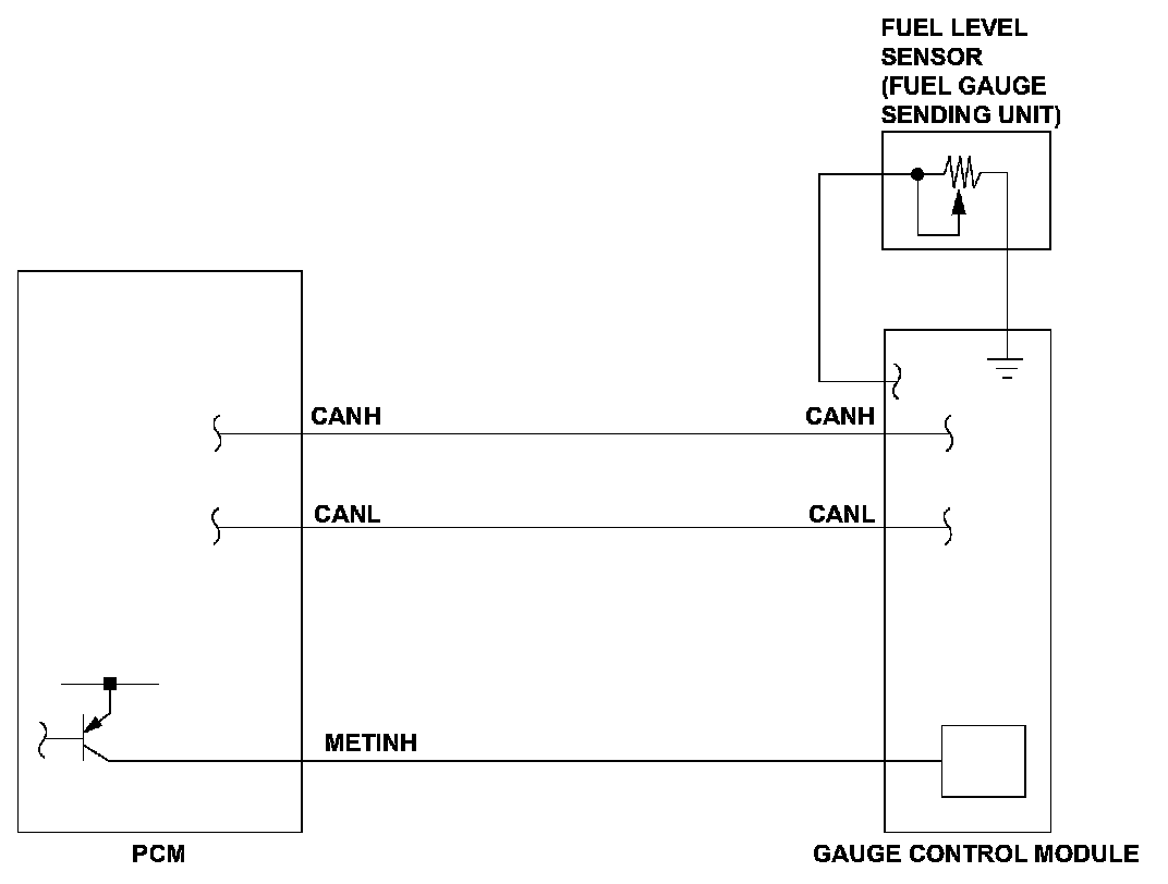 The fuel level sensor (fuel gauge sending unit) is incorporated into the fuel pump and installed in the fuel tank. Using a built-in potentiometer and float, it converts the movement of the float to electrical signals as an output that corresponds to fuel level variations in the fuel tank. The fuel level, which is indicated by the gauge control module, is sent to the powertrain control module (PCM) via the controller area network (CAN). If the PCM detects a signal from the fuel level sensor (fuel gauge sending unit) above a predetermined value for a set time, it detects a malfunction and stores a DTC.