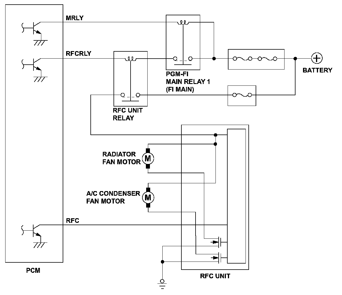 The radiator fan control (RFC) system improves the control of the radiator fan motor and the condenser fan motor and decreases noise and vibration. The powertrain control module (PCM) detects a malfunction when the RFC terminal voltage remains at 0 V. However, the RFC power is shut off temporarily when a malfunction is detected to differentiate it from the RFC protection function (*1). (Hereinafter, referred to as 'power reset') When the RFC terminal voltage remains at 0 V even when the power reset is repeated for set time, the PCM detects a malfunction of the RFC and stores a DTC.