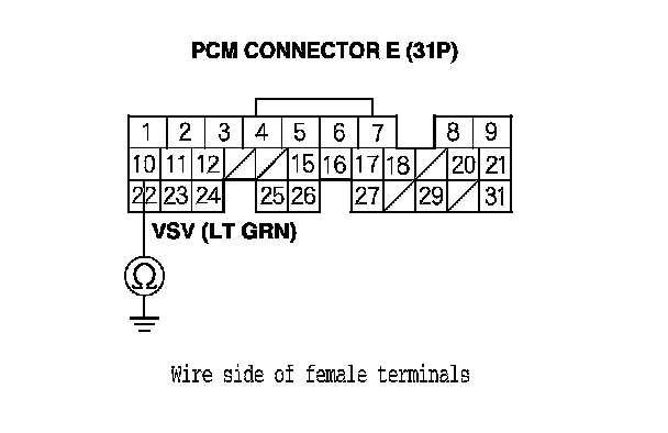 15. Check for continuity between PCM connector terminal E10 and body ground.