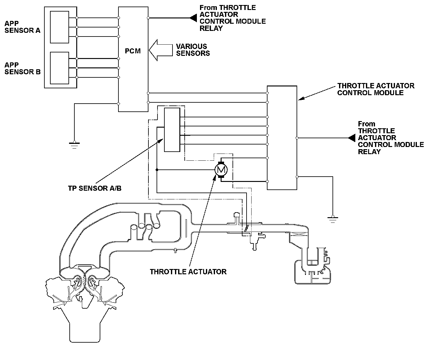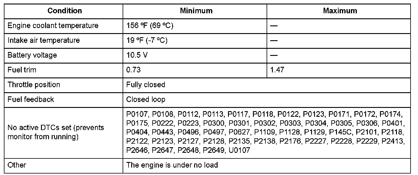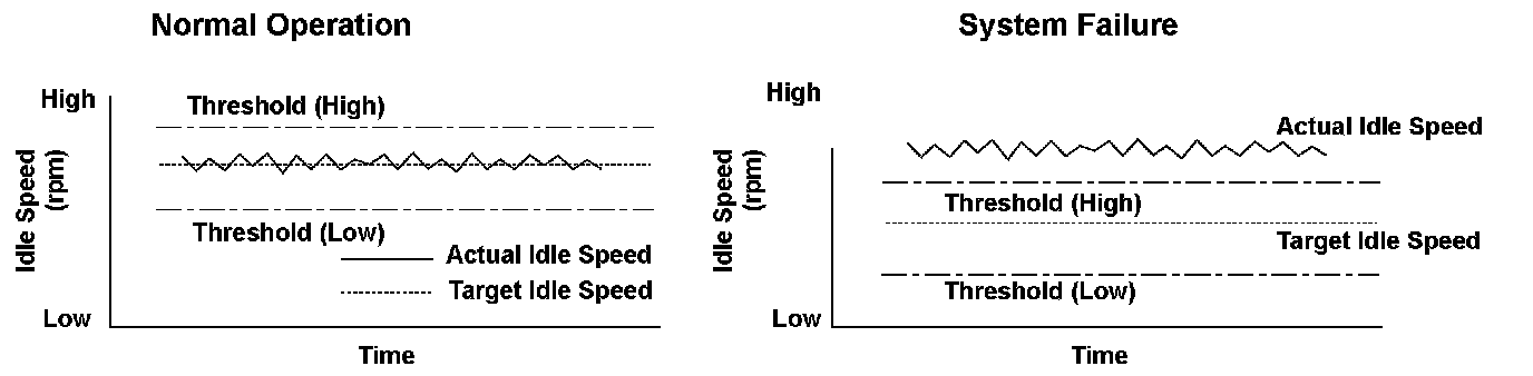 A target idle speed that meets the engine operating conditions (coolant temperature, A/C ON or OFF, etc.) is stored in the powertrain control module (PCM). The PCM monitors and controls the idle speed so that the actual idle speed is equal to the target idle speed. If the actual idle speed varies beyond a specified value from the target speed over a certain period of time, the PCM detects a malfunction in the idle speed control system and stores a DTC.