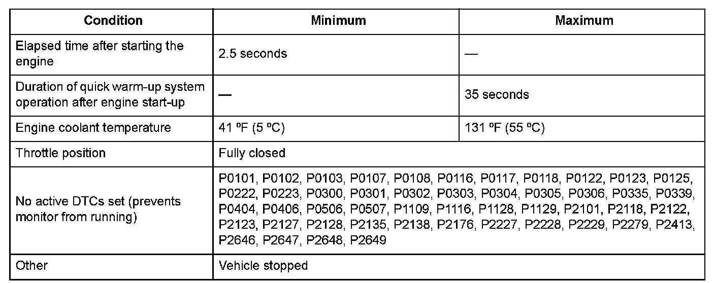 The quick warm-up system supplies additional air and retards the ignition timing when the engine is cold to activate the catalytic converter as quickly as possible. When the actual engine speed is a specified fast idle value, and it continues for a specified time, a malfunction is detected and a DTC is stored.