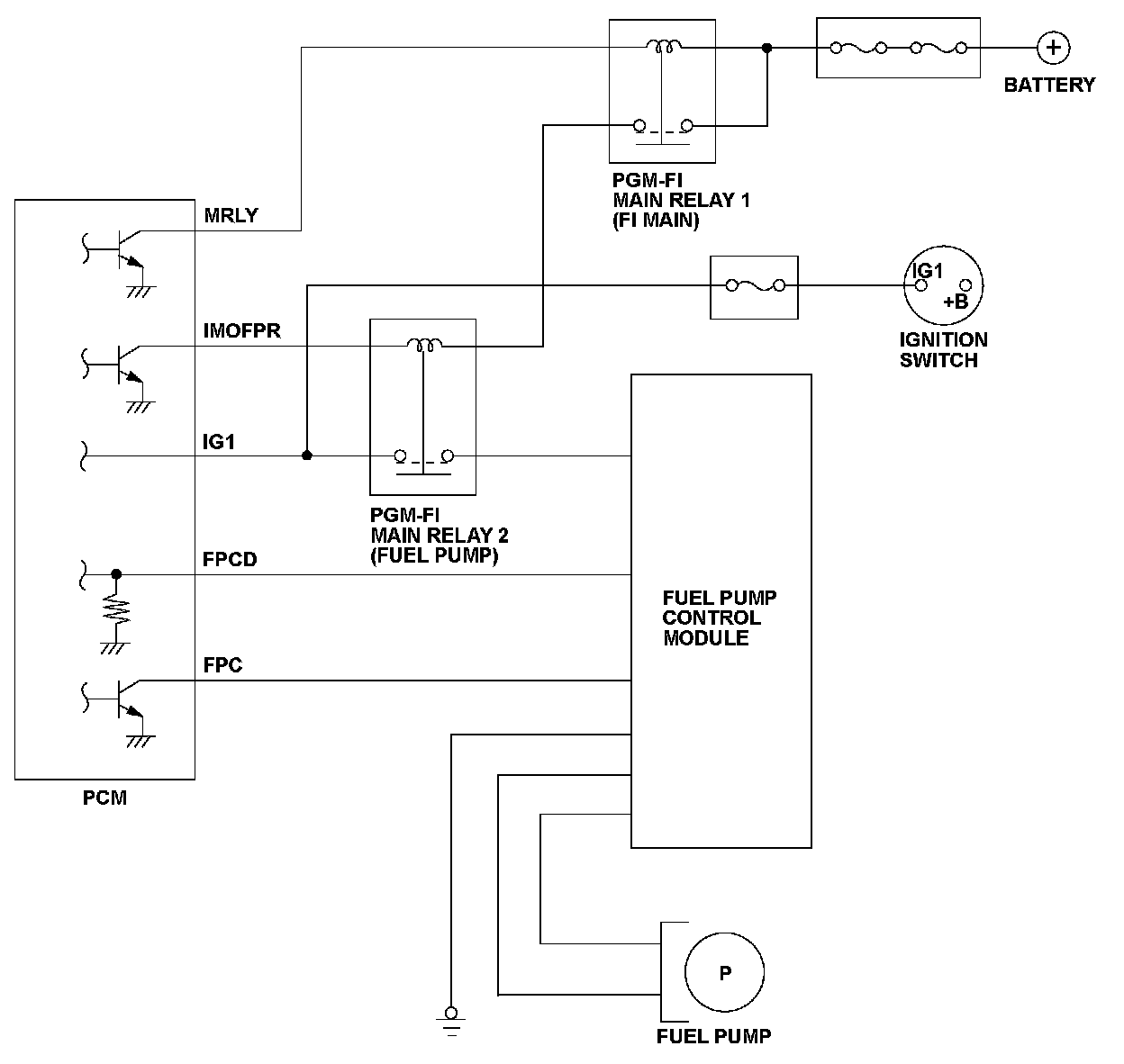 The fuel pump control module monitors the voltage applied to the fuel pump in response to the duty signal from the powertrain control module (PCM). When the voltage applied to the fuel pump is normal, the fuel pump control module outputs a high diagnostic signal, and when the voltage applied is abnormal, it outputs a low signal. The PCM monitors this diagnostic signal whenever the engine is running. When the diagnostic signal from the fuel pump control module is low for a set time, the PCM detects a malfunction and stores a DTC.