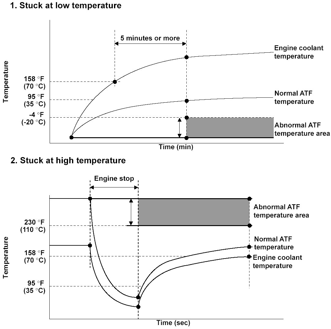 The ATF temperature sensor is a thermistor type sensor that changes resistance according to the change in ATF temperature. The powertrain control module (PCM) sends a 5 V reference voltage to the sensor through a pull-up resistor. When the ATF temperature is low, the sensor resistance increases and the PCM detects a high signal voltage. As the ATF temperature rises, the sensor resistance decreases and the PCM detects a low signal voltage. If the ATF temperature sensor signal does not change, the PCM detects a malfunction and stores a DTC.
