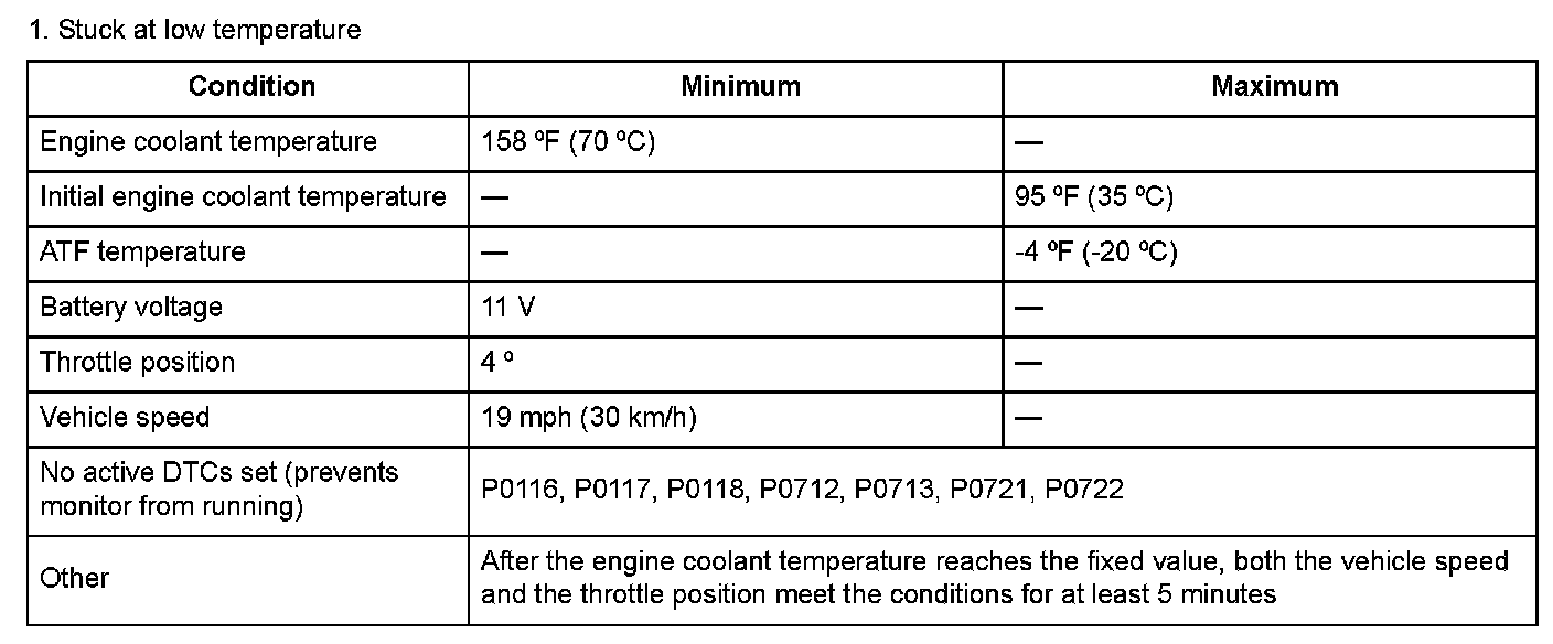 Start the engine with engine coolant temperature at 95 °F (35 °C) or less, and warm up the engine until the engine coolant temperature reaches 158 °F (70 °C) or more. Then drive the vehicle at a speed of 19 mph (30 km/h) or more with the throttle position at 4 ° or more for at least 5 minutes.