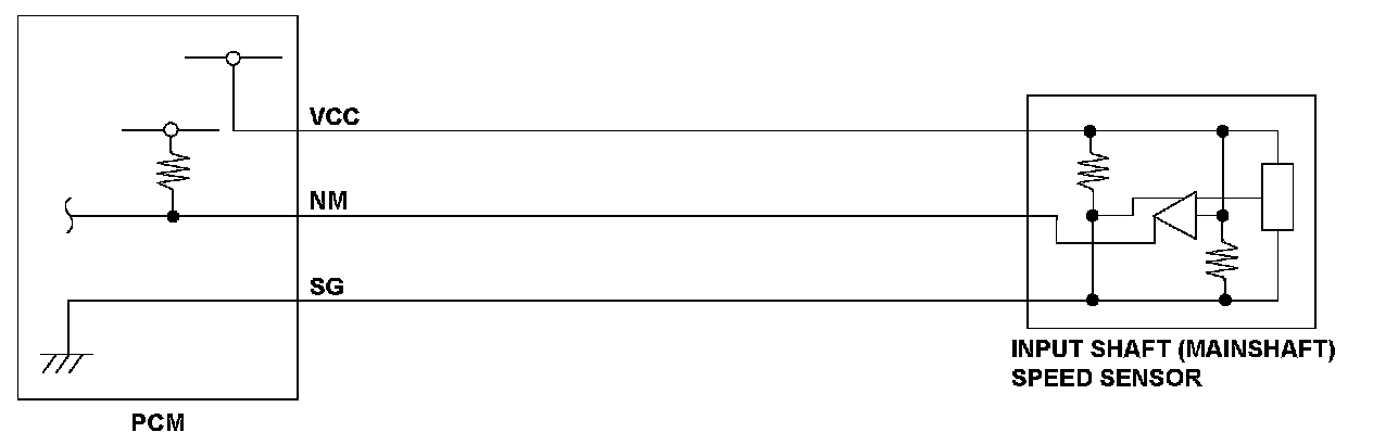 The input shaft (mainshaft) speed sensor is attached to the outside of the transmission housing. The input shaft (mainshaft) speed sensor generates a pulsing signal according to the speed of the idler gear on the input shaft (mainshaft). Using that signal, the powertrain control module (PCM) determines the speed of the input shaft (mainshaft). If no pulses occur with the input shaft (mainshaft) rotating, the PCM detects a malfunction that may be caused by an open, a temporary open, or a short to ground. Based on the fluctuation of the vehicle speed measured by the input shaft (mainshaft) speed sensor, the PCM detects a malfunction and stores a DTC.