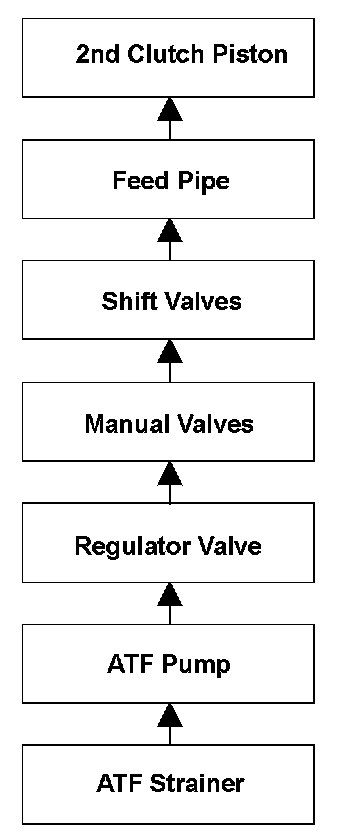To engage 2nd gear, line pressure is supplied to the 2nd clutch piston, engaging the 2nd clutch, and the secondary shaft and the secondary shaft 2nd gear are connected and revolve together. Hydraulic pressure is supplied to the 2nd clutch through the ATF strainer --> the ATF pump --> the regulator valve --> the manual valve --> the shift valves --> the feed pipe --> the 2nd clutch piston. (A shift valve failure in the supply route above is detected by the malfunction detection of each shift solenoid valve.) The powertrain control module (PCM) computes the ratio of the input shaft (mainshaft) speed to the output shaft (countershaft) speed. When the ratio is not the 2nd gear ratio, the PCM detects a malfunction of the hydraulic circuit or the 2nd clutch and stores a DTC.