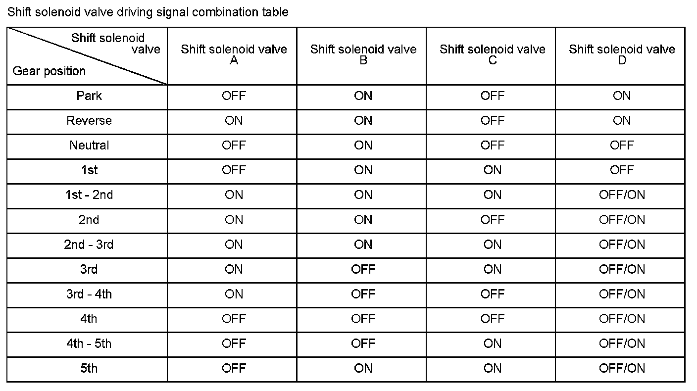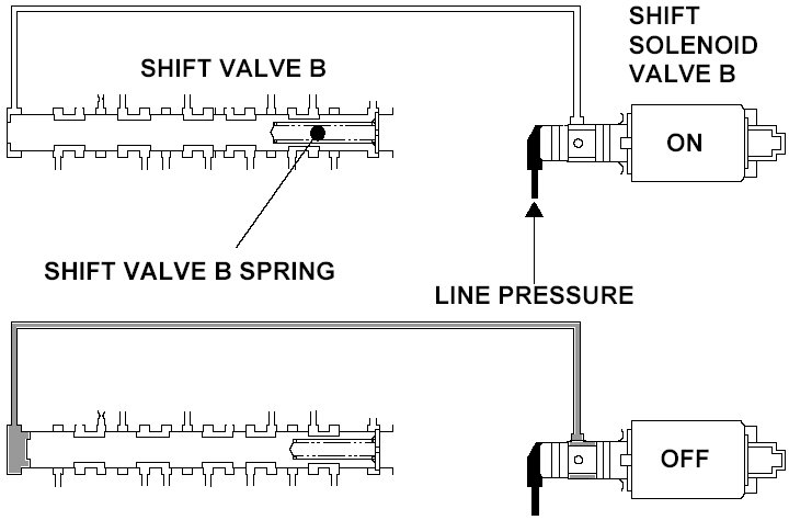Shift solenoid valve B is installed in the transmission housing. It is controlled by the ON/OFF signal from the powertrain control module (PCM) to apply modulated pressure to shift valve B. The signal from the PCM is output to apply clutch pressure control pressure to the proper gear clutch according to the gear change schedule. When the signal to shift solenoid valve B from the PCM is ON, and modulated pressure is discharged, shift valve B is inactive. When the signal to shift solenoid valve B from the PCM is OFF, and modulated pressure is applied to shift valve B, it operates against the shift valve B spring. The PCM monitors the input shaft (mainshaft) speed and the output shaft (countershaft) speed at the gear change determined by the shift schedule. When an improper gear ratio is output compared to the predetermined gear change mode, the PCM detects a shift solenoid valve B OFF failure and stores a DTC.