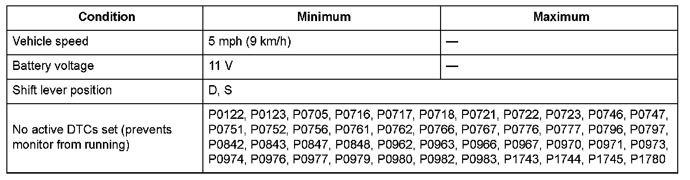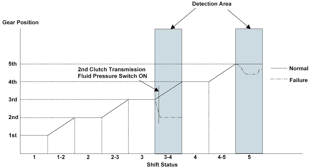 - The 2nd clutch transmission fluid pressure switch is ON against the 3rd --> 4th gear upshift command for at least 1.5 seconds.