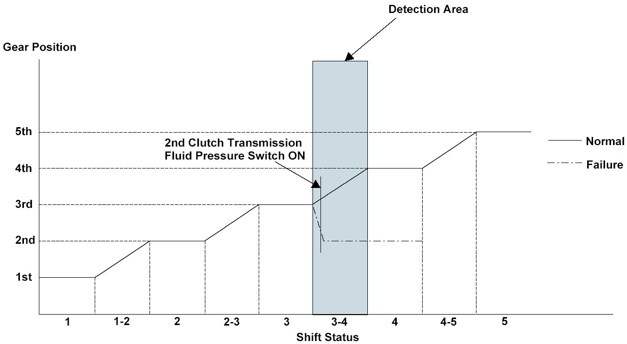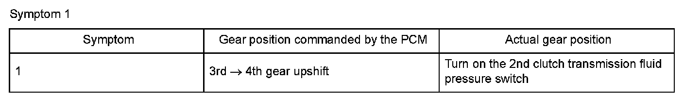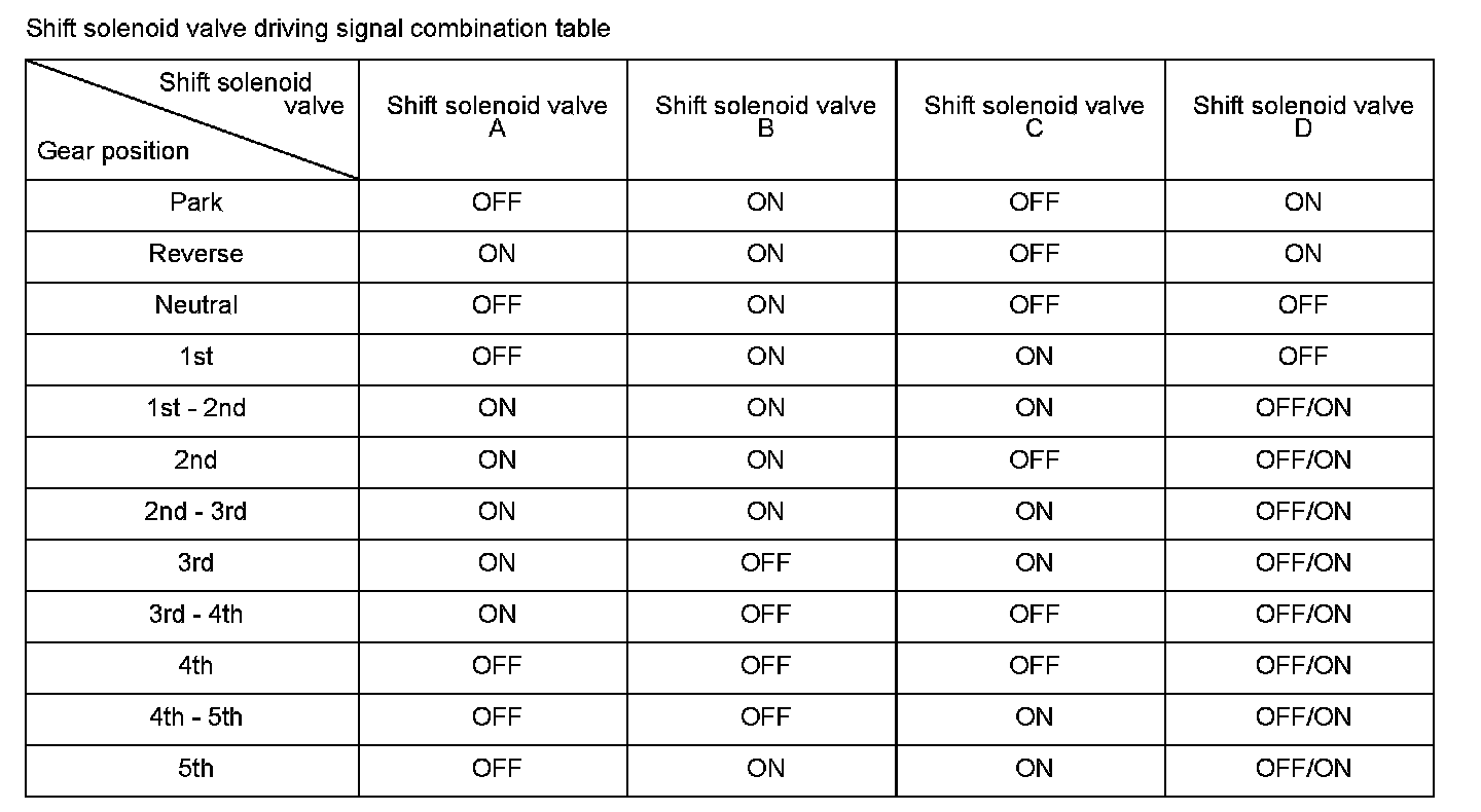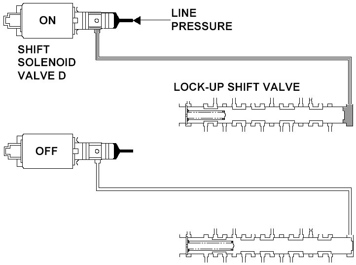 Shift solenoid valve D is installed in the transmission housing. It is controlled by the ON/OFF signal from the powertrain control module (PCM) to apply modulated pressure to the lock-up shift valve. The signal from the PCM is output to apply clutch pressure control pressure to the proper gear clutch according to the gear change schedule. When the signal to shift solenoid valve D from the PCM is ON, and modulated pressure is applied to the lock-up shift valve, it operates against the lock-up shift valve spring. When the signal to shift solenoid valve D from the PCM is OFF, and modulated pressure is discharged, the lock-up shift valve is inactive. The PCM monitors the input shaft (mainshaft) speed and the output shaft (countershaft) speed at the gear change determined by the shift schedule. When an improper gear ratio is output compared to the predetermined gear change mode, the PCM detects a shift solenoid valve D OFF failure and stores a DTC.