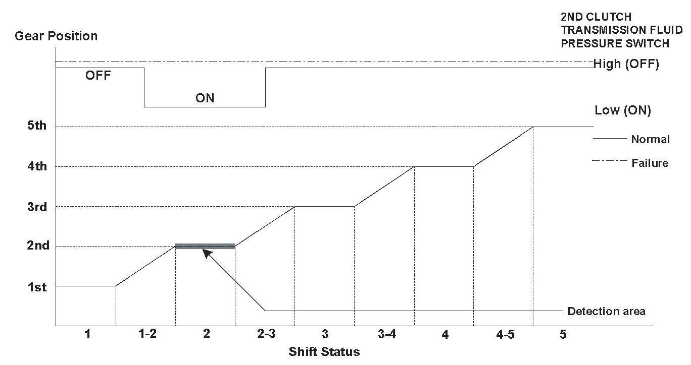 The 2nd clutch transmission fluid pressure switch is installed in the hydraulic pressure circuit to the 2nd clutch. When hydraulic pressure is supplied to the 2nd clutch, the switch is turned ON. When hydraulic pressure is not supplied to the 2nd clutch, the switch is turned OFF. The signal from the 2nd clutch transmission fluid pressure switch is input to the powertrain control module (PCM). The PCM detects the hydraulic pressure supply conditions at the gear change to 2nd gear (1st --> 2nd, 3rd --> 2nd) to reduce the shock that occurs at the gear change. If the 2nd clutch transmission fluid pressure switch is OFF while driving the vehicle with the rotation speed ratio of the input/output pulses is that of 2nd gear, the PCM detects a 2nd clutch transmission fluid pressure switch failure and stores a DTC.