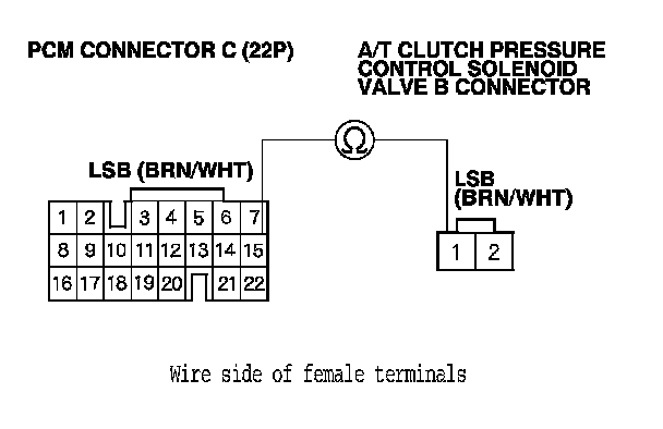 12. Check for continuity between PCM connector terminal C15 and A/T clutch pressure control solenoid valve B connector terminal No. 1.