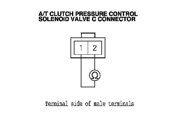 8. Measure the resistance between A/T clutch pressure control solenoid valve C connector terminals No. 1 and No. 2.