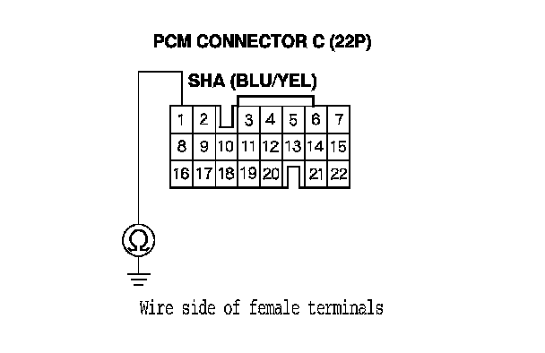 10. Measure the resistance between PCM connector terminal C1 and body ground.