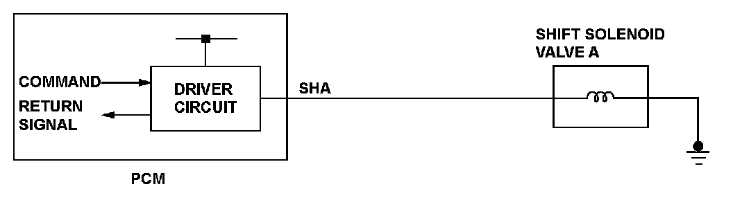 When shift solenoid valves A and D are turned ON, or when shift solenoid valves B and C are turned OFF, the hydraulic pressure circuit opens. The hydraulic pressure circuit supplies/discharges hydraulic pressure to/from each clutch according to the combination of the ON/OFF status of the shift solenoid valves. The powertrain control module (PCM) commands the driver circuit to turn on the shift solenoid valve. The circuit diagnoses malfunctions such as a circuit short or open, and sends back a return signal during the PCM's command. When the return signal does not match the PCM command to turn OFF the shift solenoid valve, the PCM detects a malfunction and stores a DTC.