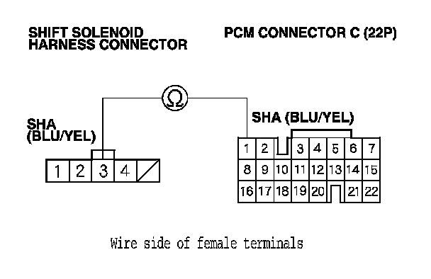 12. Check for continuity between PCM connector terminal C1 and shift solenoid harness connector terminal No. 3.
