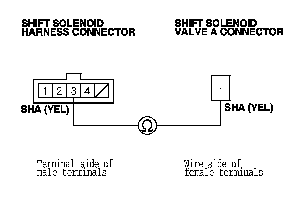 14. Check for continuity between shift solenoid harness connector terminal No. 3 and the shift solenoid valve A connector terminal.