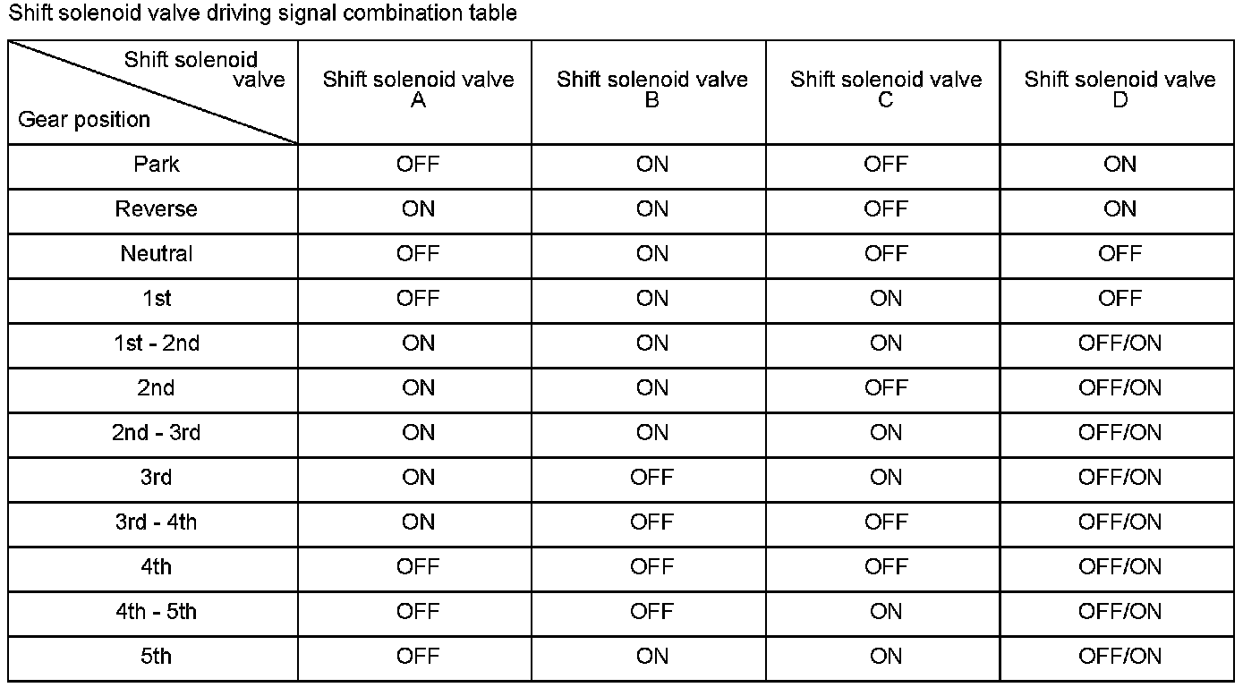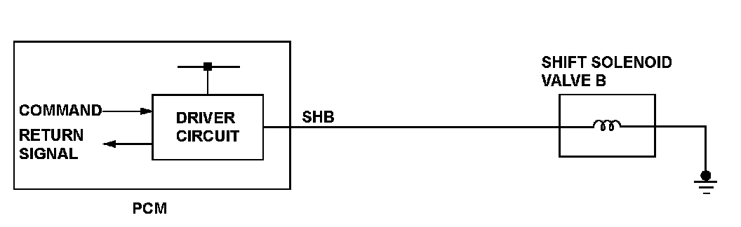 When shift solenoid valves A and D are turned ON, or when shift solenoid valves B and C are turned OFF, the hydraulic pressure circuit opens. The hydraulic pressure circuit supplies/discharges hydraulic pressure to/from each clutch according to the combination of the ON/OFF status of the shift solenoid valves. The powertrain control module (PCM) commands the driver circuit to turn on the shift solenoid valve. The circuit diagnoses malfunctions such as a circuit short or open, and sends back a return signal during the PCM's command. When the return signal does not match the PCM command to turn ON the shift solenoid valve, the PCM detects a malfunction and stores a DTC.