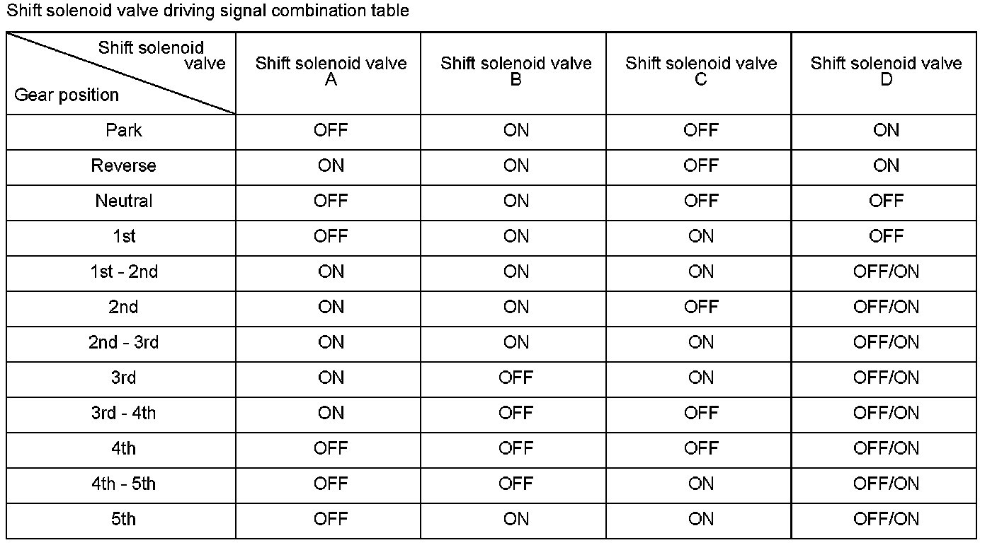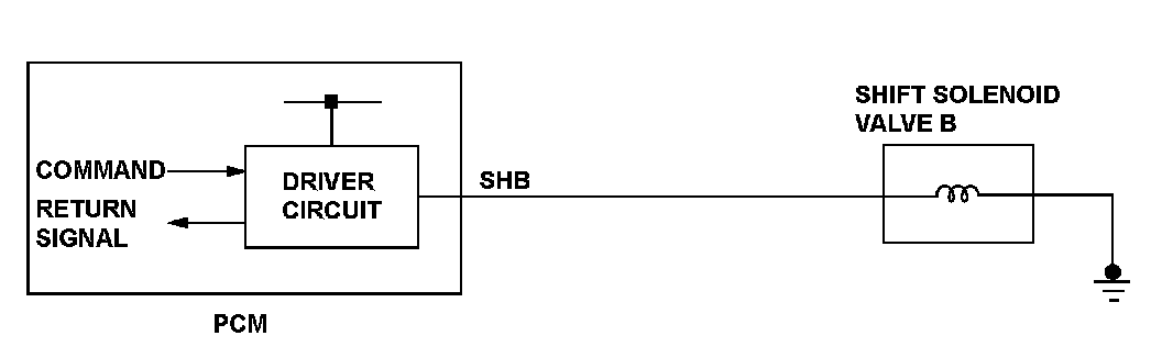 When shift solenoid valves A and D are turned ON, or when shift solenoid valves B and C are turned OFF, the hydraulic pressure circuit opens. The hydraulic pressure circuit supplies/discharges hydraulic pressure to/from each clutch according to the combination of the ON/OFF status of the shift solenoid valves. The powertrain control module (PCM) commands the driver circuit to turn on the shift solenoid valve. The circuit diagnoses malfunctions such as a circuit short or open, and sends back a return signal during the PCM's command. When the return signal does not match the PCM command to turn OFF the shift solenoid valve, the PCM detects a malfunction and stores a DTC.