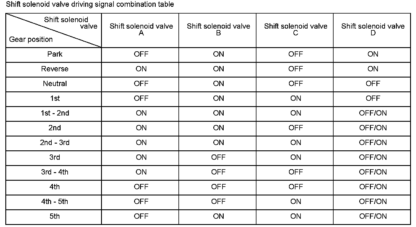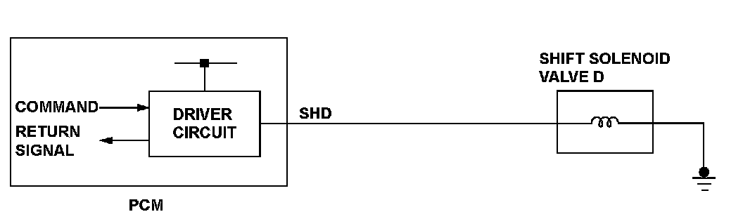 When shift solenoid valves A and D are turned ON, or when shift solenoid valves B and C are turned OFF, the hydraulic pressure circuit opens. The hydraulic pressure circuit supplies/discharges hydraulic pressure to/from each clutch according to the combination of the ON/OFF status of the shift solenoid valves. The powertrain control module (PCM) commands the driver circuit to turn on the shift solenoid valve. The circuit diagnoses malfunctions such as a circuit short or open, and sends back a return signal during the PCM's command. When the return signal does not match the PCM command to turn OFF the shift solenoid valve, the PCM detects a malfunction and stores a DTC.