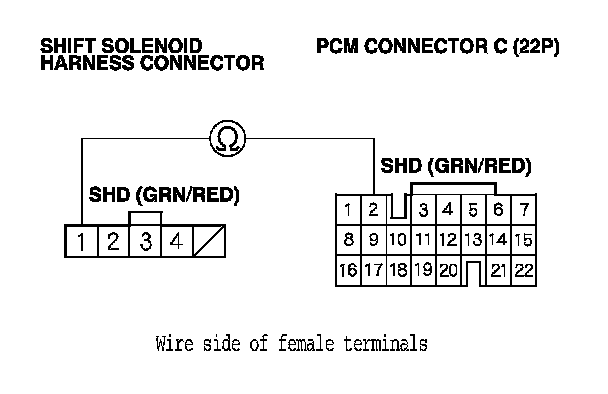 12. Check for continuity between PCM connector terminal C2 and shift solenoid harness connector terminal No. 1.