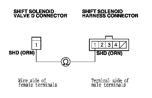 14. Check for continuity between shift solenoid harness connector terminal No. 1 and the shift solenoid valve D connector terminal.