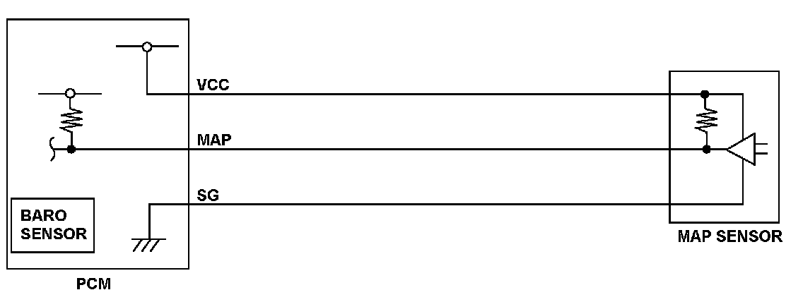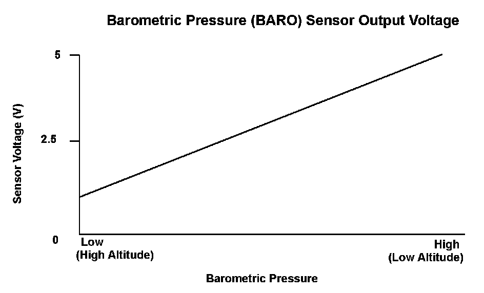 The barometric pressure (BARO) sensor is built into the powertrain control module (PCM) and monitors atmospheric pressure. The PCM estimates appropriate intake airflow from the manifold absolute pressure (MAP) sensor output voltage and the BARO sensor output voltage. If the BARO sensor output voltage is a specified range, the PCM detects a malfunction and stores a DTC.