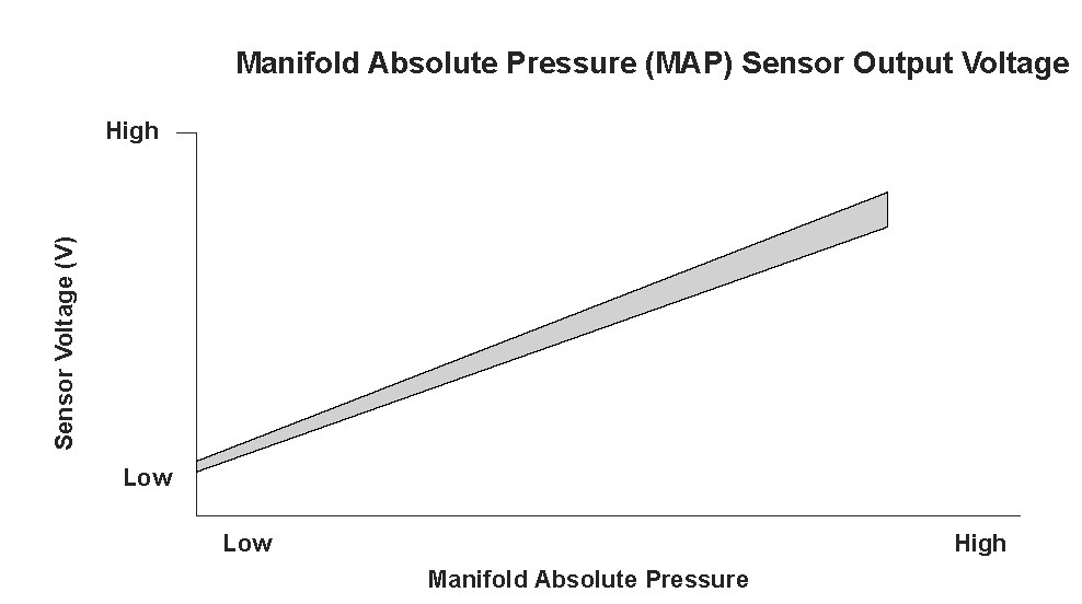 The manifold absolute pressure (MAP) sensor senses manifold absolute pressure (vacuum) and converts it into electrical signals. The MAP sensor outputs low signal voltage at high vacuum (idling) and high signal voltage at low vacuum (throttle valve wide open). The powertrain control module (PCM) compares a predetermined MAP value at a given throttle position and manifold absolute pressure to the output voltage value of the MAP sensor. If the MAP sensor outputs lower voltage than expected, the PCM detects a malfunction and stores a DTC.