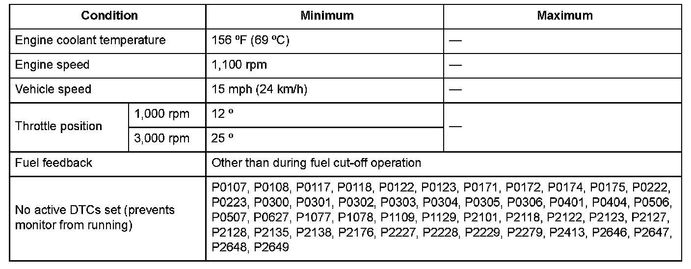 2. Drive the vehicle at a speed of 15 mph (24 km/h) or more with a throttle position as specified under Enable Conditions for at least 2 seconds.