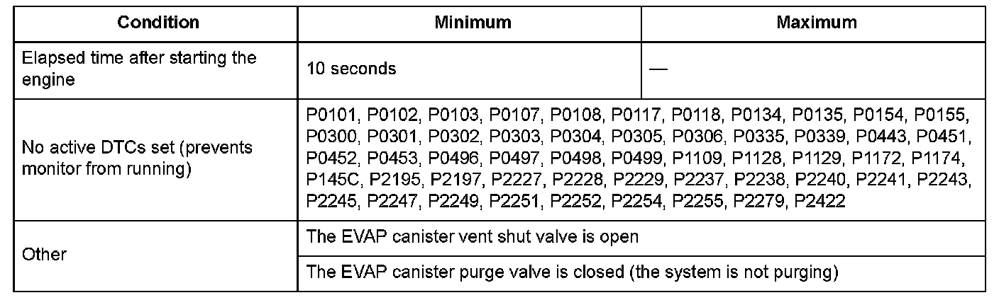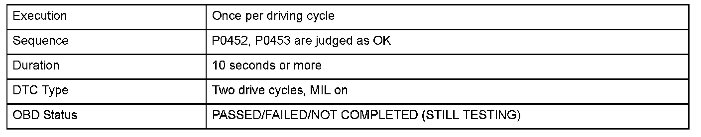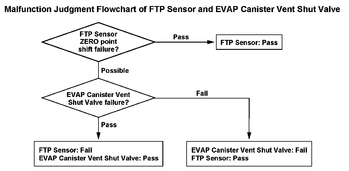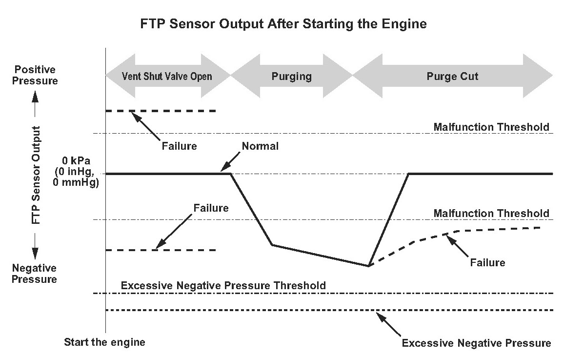 The fuel tank pressure is about 0 kPa (0 inHg, 0 mmHg) when starting a cold engine. When the fuel tank pressure (FTP) sensor output value is out of a specified range and the powertrain control module (PCM) judges that there's no other cause [no evaporative emission (EVAP) canister vent shut valve failure, etc.] for the FTP sensor zero point shift, the PCM detects an FTP sensor malfunction. However, if the FTP sensor output when starting the engine, is a prescribed negative value or less (excessive negative pressure is detected), the malfunction judgment should be done as follows because it is difficult to distinguish the FTP sensor zero point shift (P1454) from the EVAP canister vent shut valve failure (P2422).