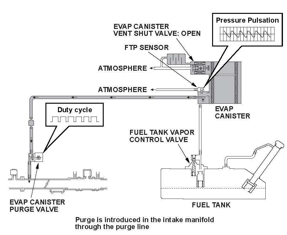The fuel vapor in the fuel tank is temporarily stored in the evaporative emission (EVAP) canister and drawn into the engine through the EVAP canister purge valve. The powertrain control module (PCM) controls the amount of vapor introduced into the engine by varying the duty cycle of the EVAP canister purge valve according to the condition of the engine.