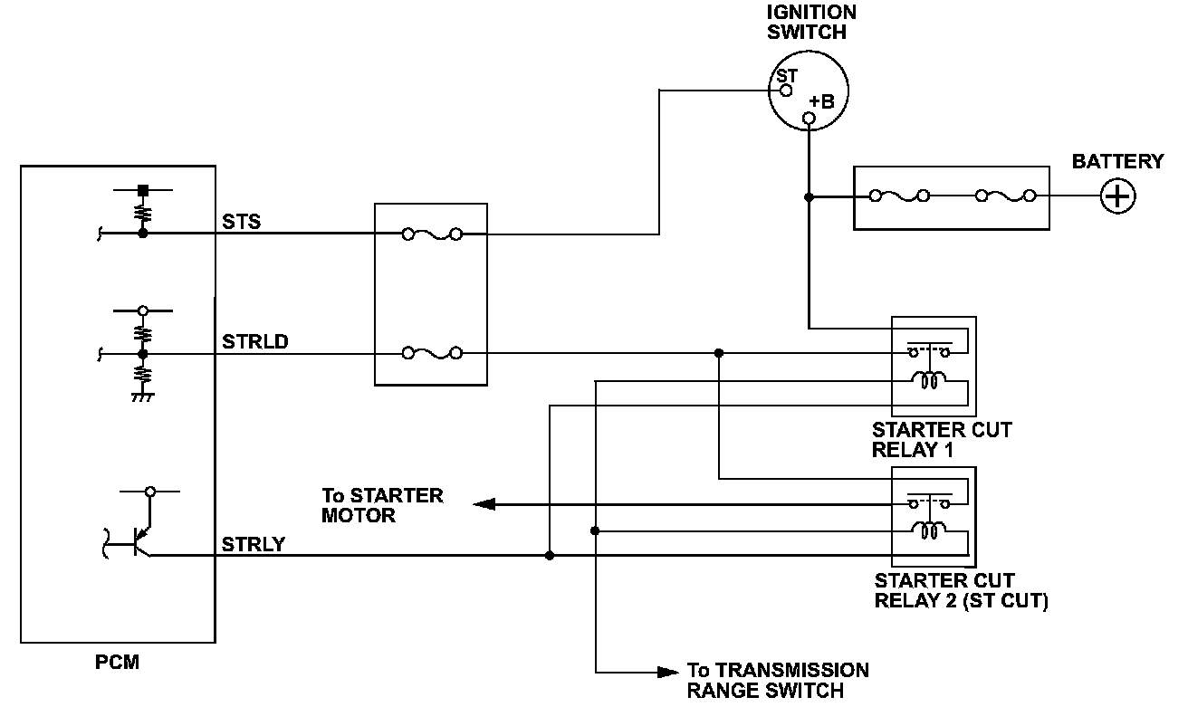 The powertrain control module (PCM) compares the ON command signal to the starter with the return signal from the starter cut relay. When the signals do not coincide for a set time, the PCM detects a malfunction and stores a DTC.