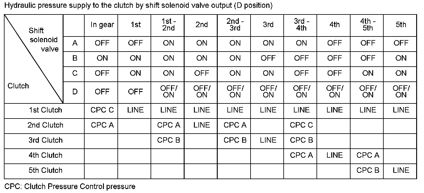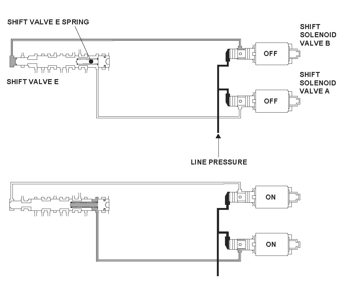 Shift valve E is in the control circuit of the transmission. It is controlled by pressure from shift solenoid valve B, and it is locked by the line pressure. It switches off when shift solenoid valve B turns off and shift solenoid valve A turns on. The powertrain control module (PCM) monitors the input shaft (mainshaft) speed, and the output shaft (countershaft) speed at the gear change determined by the shift schedule. When an improper gear ratio output is compared to the predetermined gear change mode, the PCM detects a shift valve E ON failure and stores a DTC.