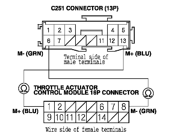 19. Check for continuity between throttle actuator control module 16P connector terminal No. 1 and C251 connector (13P) terminal No. 13, and then between throttle actuator control module 16P connector terminals No. 8 and C251 connector (13P) terminal No. 6.