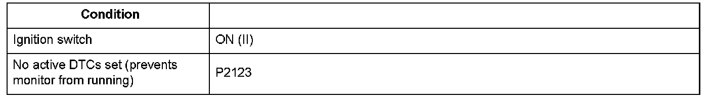 The APP sensor A output voltage is 0.1 V or less for at least 200 milliseconds.