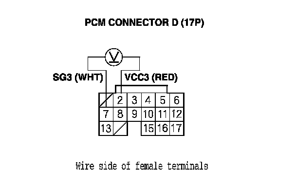 7. Measure the voltage between PCM connector terminals D2 and D7.