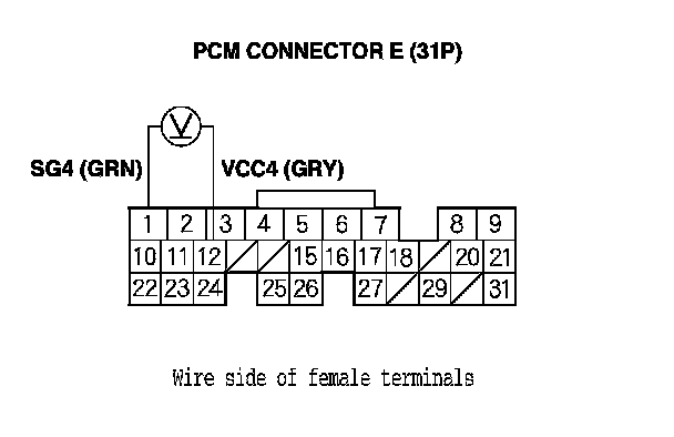 7. Measure the voltage between PCM connector terminals E1 and E12.