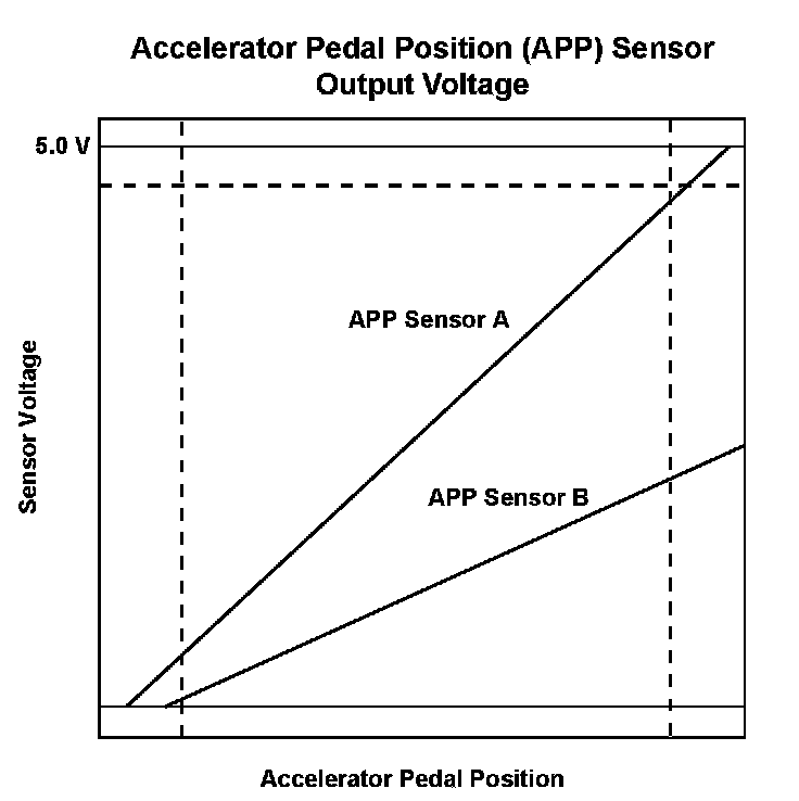 Accelerator pedal position (APP) sensor A and accelerator pedal position (APP) sensor B are potentiometers. They are installed on the accelerator pedal. When the accelerator pedal is pressed, APP sensors A and B detect the accelerator opening value. The accelerator pedal opening value is converted to a signal in APP sensors A and B and transmitted to the powertrain control module (PCM) to compute the target position. APP sensor A is for the primary control, and APP sensor B is a back-up of APP sensor A in case it malfunctions. Both sensors compare their output voltage to each other for malfunction detection. When the voltage difference of APP sensor B is out of a fixed range for a set time, the PCM detects a malfunction and stores a DTC.