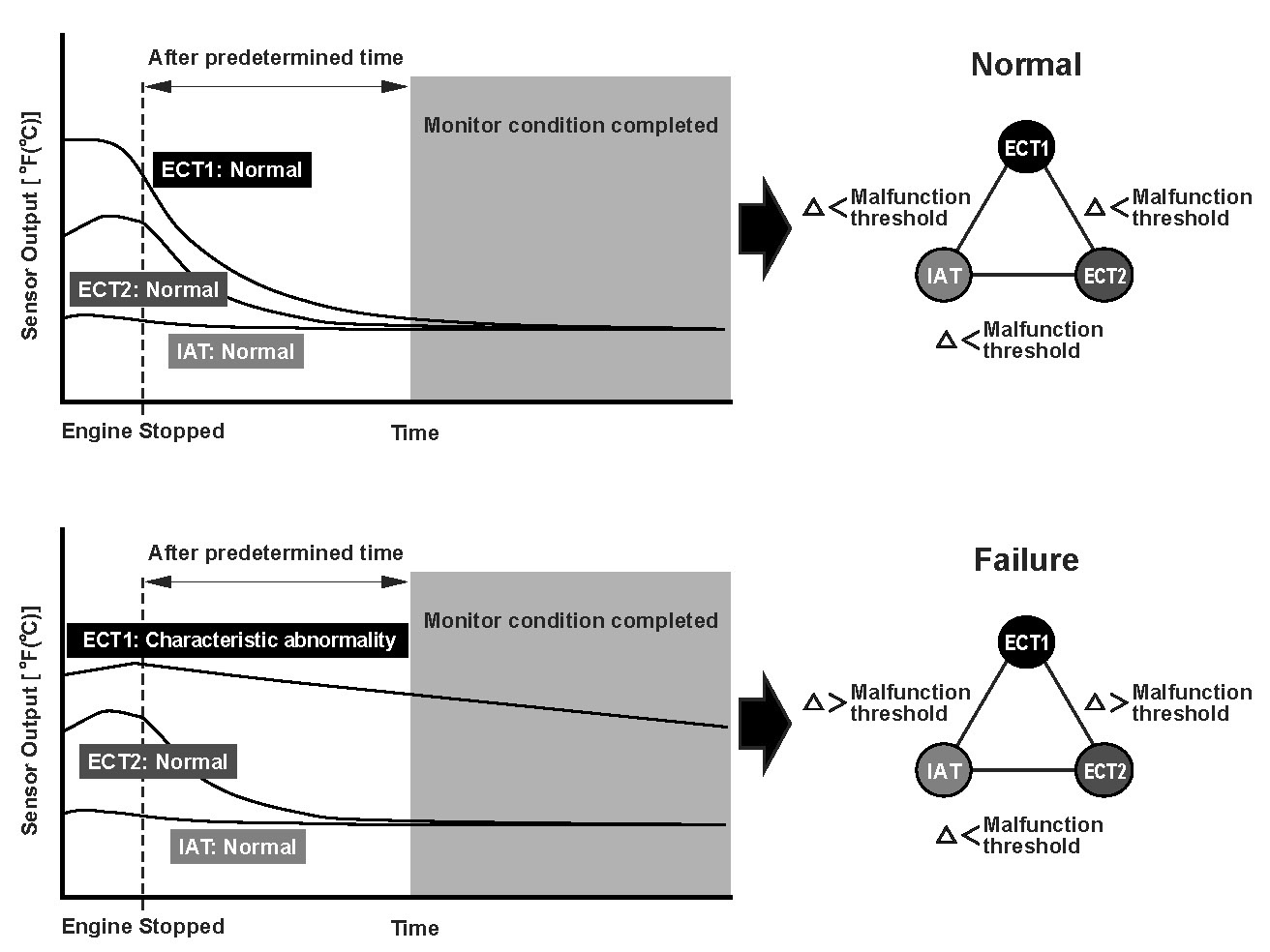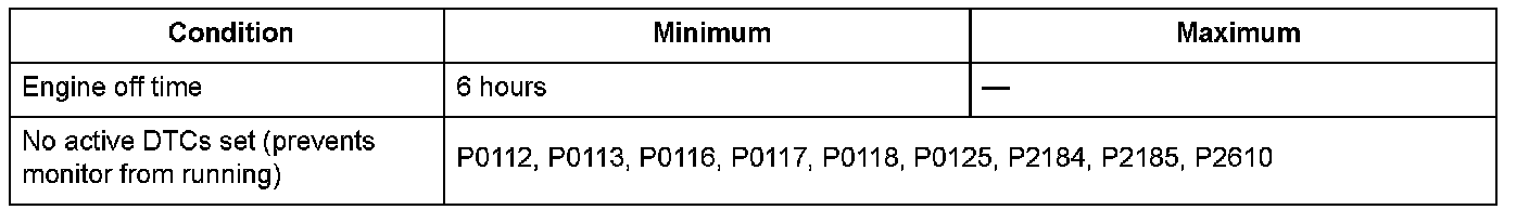 Two engine coolant temperature sensors and one intake air temperature sensor are used by the powertrain control module (PCM). When the engine is stopped and enough time has passed, the temperature of the engine will equalize to the ambient temperature. When an inappropriate temperature is detected after comparing the temperature readings of each sensor, the PCM detects a malfunction in the corresponding sensor and stores a DTC.