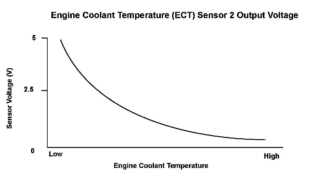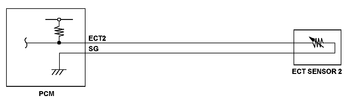 Engine coolant temperature (ECT) sensor 2 is a thermistor attached to the water passage. The powertrain control module (PCM) applies voltage (about 5 V) to the ECT2 signal circuit through a pull up resistor. As the engine coolant temperature cools, ECT sensor 2 resistance increases, and the PCM detects a high signal voltage. As the engine coolant warms, the sensor resistance decreases, and the PCM detects a low signal voltage. If the ECT sensor 2 output voltage is a set value when the engine coolant temperature is high, the PCM detects a malfunction and stores a DTC.