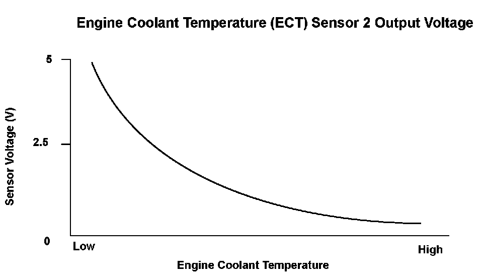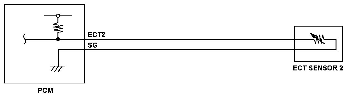 Engine coolant temperature (ECT) sensor 2 is a thermistor attached to the water passage. The powertrain control module (PCM) applies voltage (about 5 V) to the ECT2 signal circuit through a pull up resistor. As the engine coolant temperature cools, ECT sensor 2 resistance increases, and the PCM detects a high signal voltage. As the engine coolant warms, the sensor resistance decreases, and the PCM detects a low signal voltage. If the ECT sensor 2 output voltage is a set value when the engine coolant temperature is low, the PCM detects a malfunction and stores a DTC.