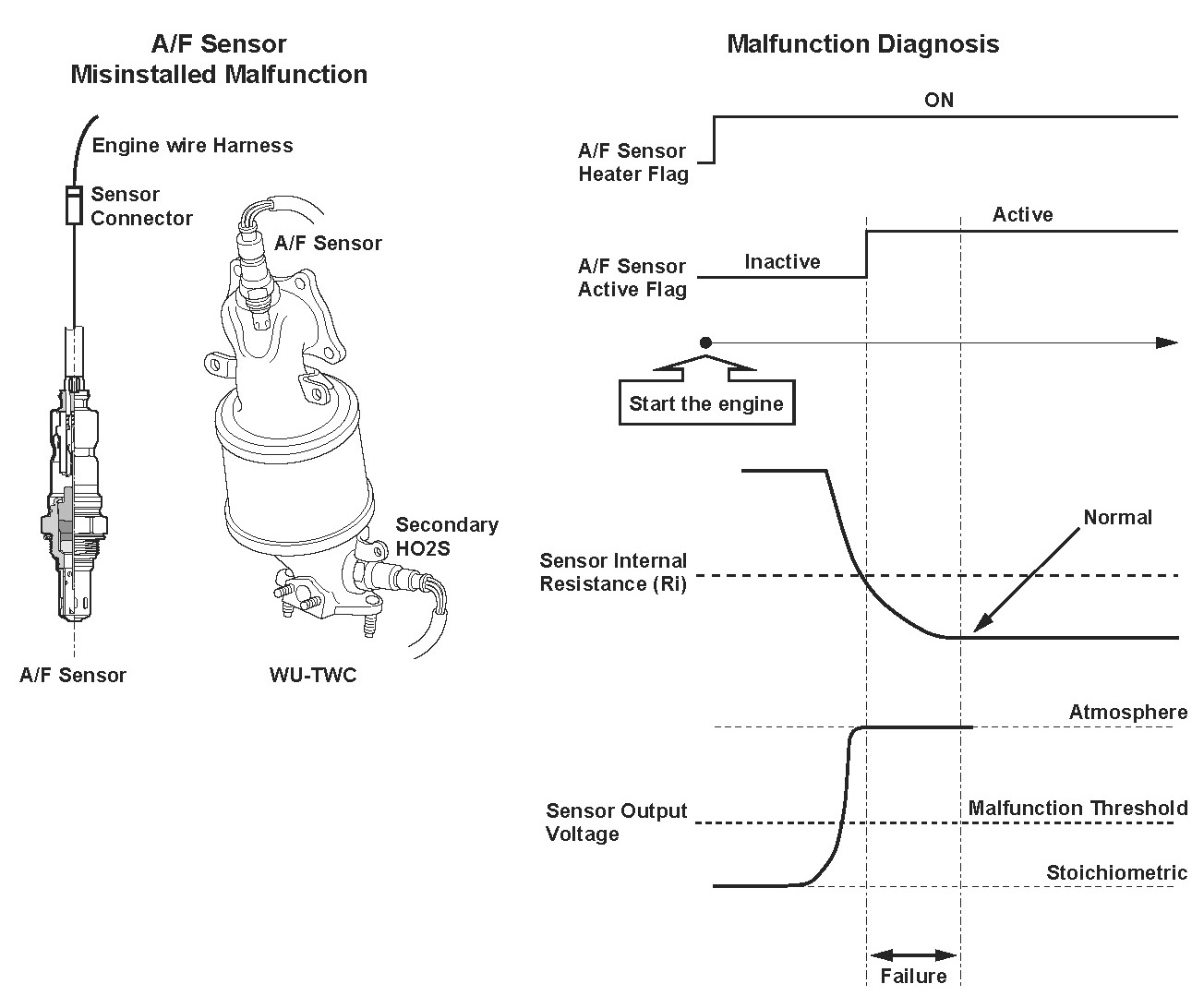 When the front air/fuel ratio (A/F) sensor (bank 2, sensor 1) is properly connected to the engine wire harness, but it is not installed in the exhaust pipe, the A/F feedback is not done properly even if the front A/F sensor is active after starting the engine. Thus, the exhaust emissions increase. When the front A/F sensor output stays out of the normal range after the front A/F sensor becomes active, the powertrain control module (PCM) detects that the front A/F sensor is not properly installed and a DTC is stored.