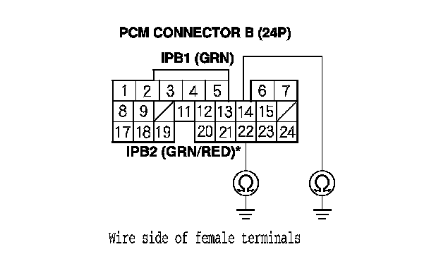 10. Check for continuity between PCM connector terminal B14 (B22)* and body ground.