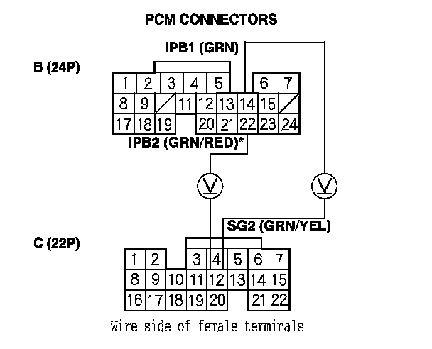 13. Measure the voltage between PCM connector terminals B14 (B22)* and C12.