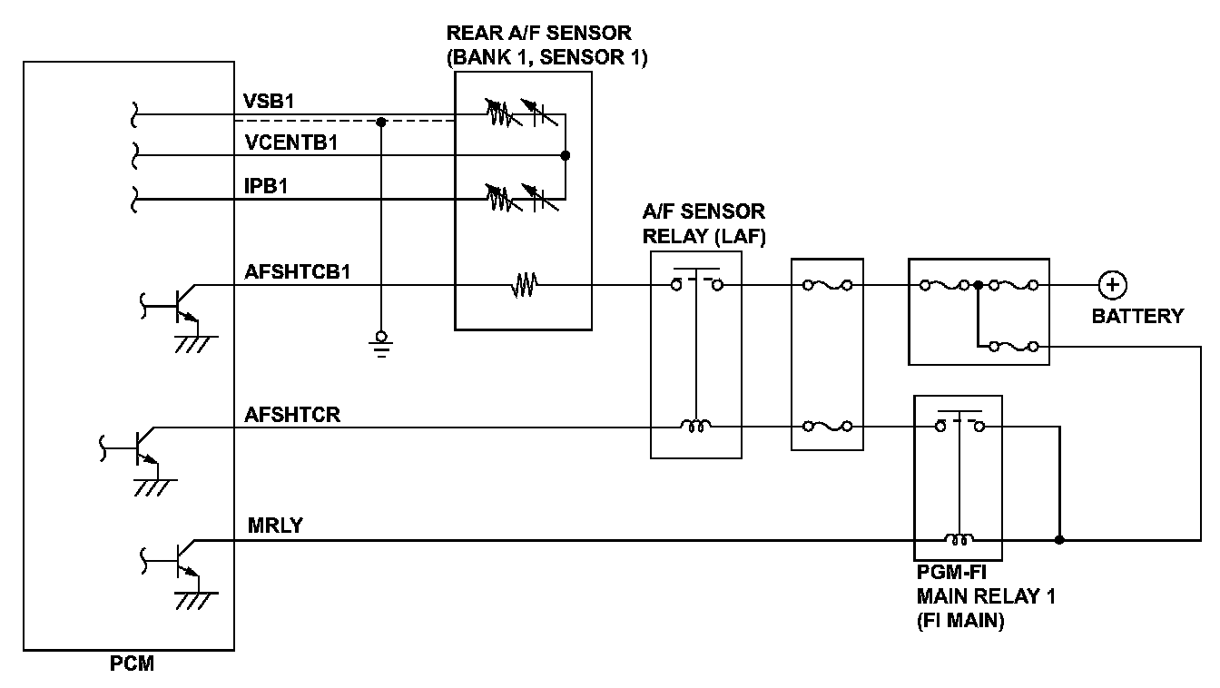 The rear air/fuel ratio (A/F) sensor (bank 1, sensor 1) is installed in the exhaust manifold and detects oxygen content in the exhaust gas. The rear A/F sensor transmits a signal to the powertrain control module (PCM), and it enables overall feedback control. The PCM controls fuel injection duration by comparing the target air/fuel ratio with the rear A/F sensor signal. When the VSB1 terminal voltage and the PCM internal signal voltage are more than a specified value for more than a predetermined time, the PCM detects a malfunction and stores a DTC.