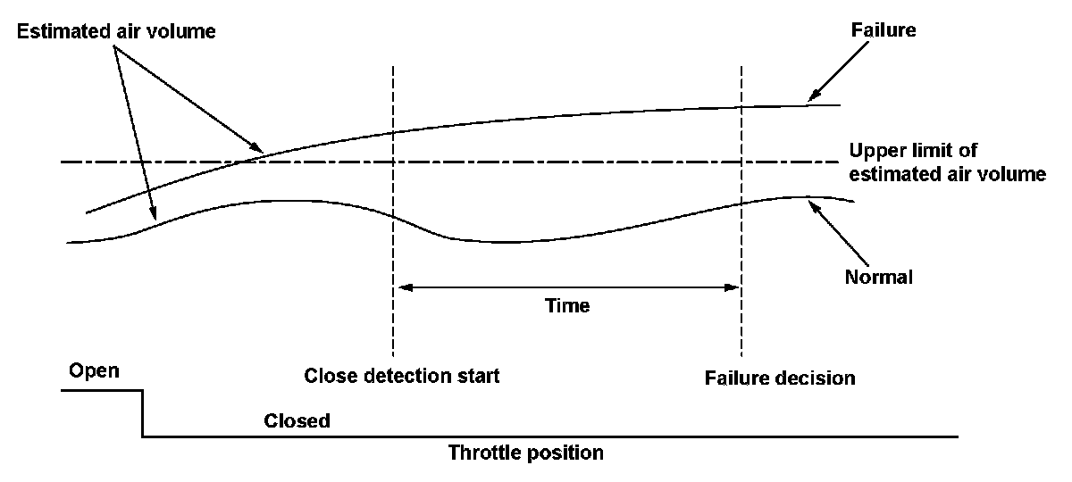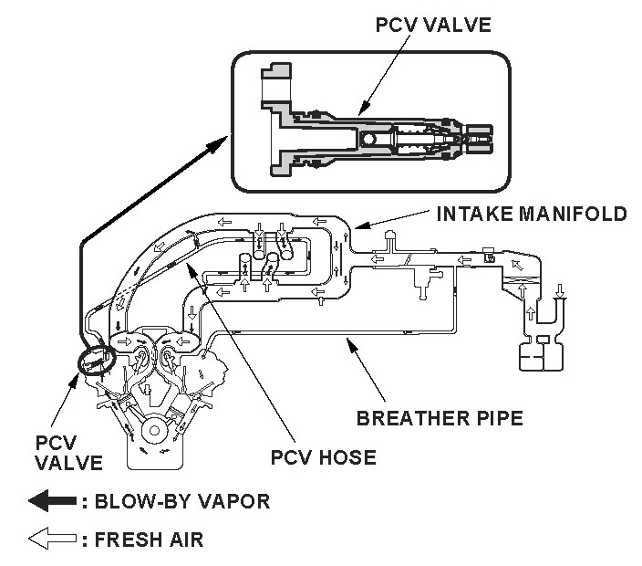 The positive crankcase ventilation (PCV) system reduces hydrocarbon (HC) emissions. The PCV system recirculates unburned air/fuel mixture (blow-by vapor) into the intake manifold so that it is drawn into the engine and burned, thus reducing HC. If the PCV hose comes off at idle with the throttle closed, the amount of air supplied to the engine is considerably more than the amount of air the idle control system supplies. The powertrain control module (PCM) estimates the amount of air supplied to the engine while the throttle valve is fully closed, and if the estimated amount is more than the upper limit, it detects a malfunction and stores a DTC.
