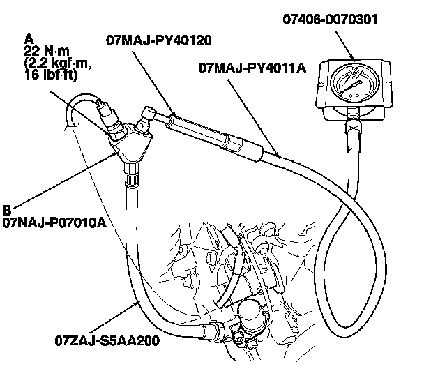 10. Remove the rocker arm oil pressure switch (A), attach the special tools as shown, then attach the rocker arm oil pressure switch to the pressure gauge adapter (B).