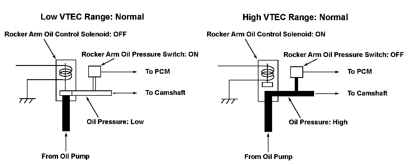 The VTEC system activates the rocker arm oil control solenoid by command from the powertrain control module (PCM), and it charges/discharges the hydraulic circuit of the VTEC mechanism that switches valve timing between Low and High. The PCM monitors oil pressure in the hydraulic circuit of the VTEC mechanism using the rocker arm oil pressure switch downstream of the rocker arm oil control solenoid. If there is a difference between the oil pressure condition in the hydraulic circuit determined by the PCM command and the oil pressure condition determined by the status of the rocker arm oil pressure switch, the system is considered faulty, and a DTC is stored.