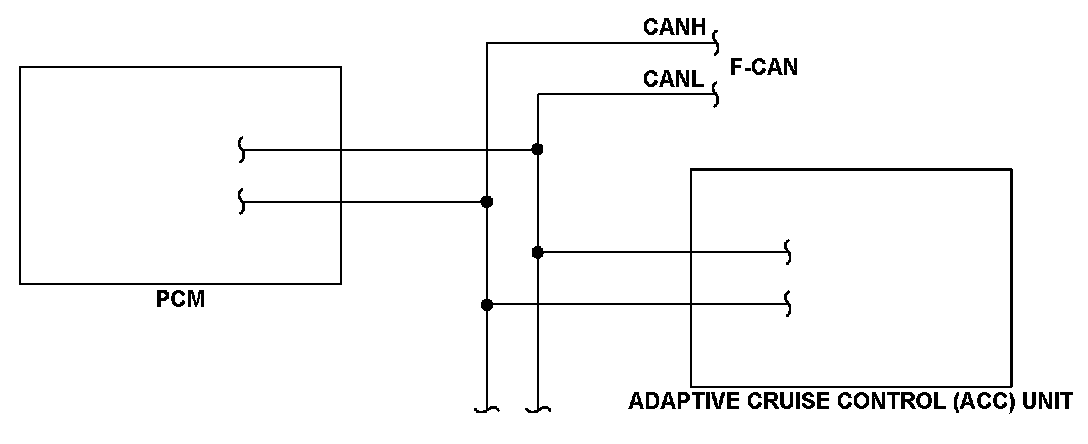 The controller area network (CAN) transmits/receives pulsing signals to/from the control modules simultaneously by using two signal lines (CANH and CANL). When the powertrain control module (PCM) does not receive the signals from the adaptive cruise control (ACC) unit via the F-CAN lines for a set time, the PCM detects a malfunction and stores a DTC.