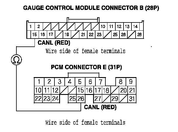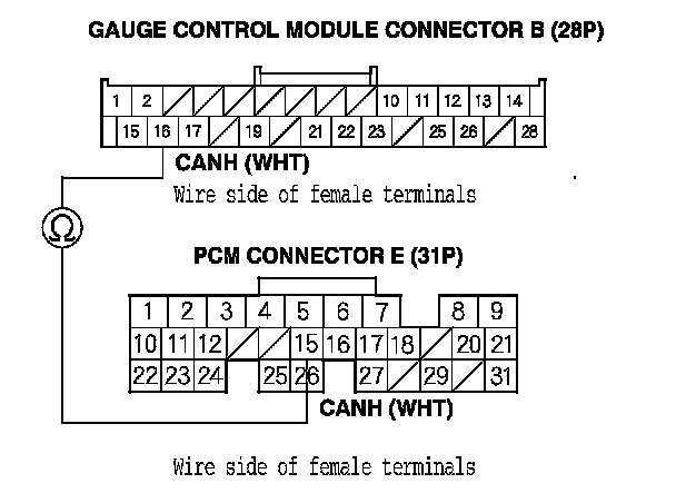 9. Check for continuity between PCM connector terminal E15 and gauge control module connector B (28P) terminal No. 16.