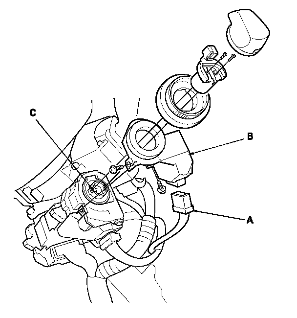 5. Remove the two screws and the immobilizer control unit-receiver from the ignition key cylinder (C).